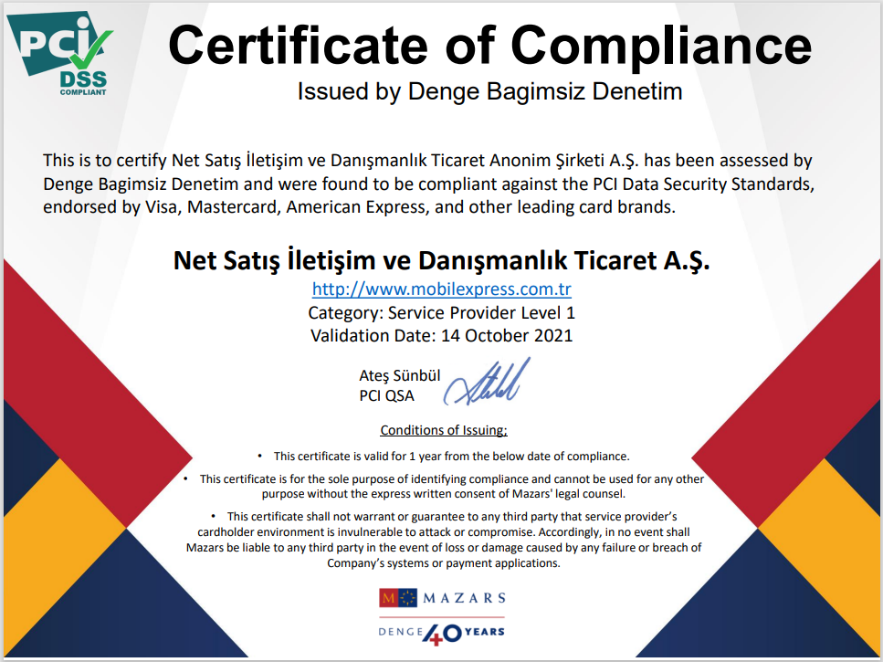 Mobilexpress kredi kartı veri ve işlem güvenliğinde dünyanın en üst düzey standardı olan PCI DSS LEVEL 1 uyumluluk sertifikasına sahiptir.